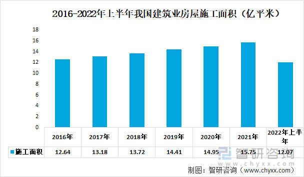 建筑行业的发展趋势在很大程度上决定了我国建筑防水材料市场的总体趋势。近年来,我国建筑业施工面积持续增长。数据显示,2021年我国建筑业房屋施工面积达到15.755亿平方米,比上年增长了5.4%。2022年上半年我国建筑企业房屋建筑施工面积1207367.21万平方米,同比增长1.2%。由此可见,对建筑防水材料的需求较为稳定。