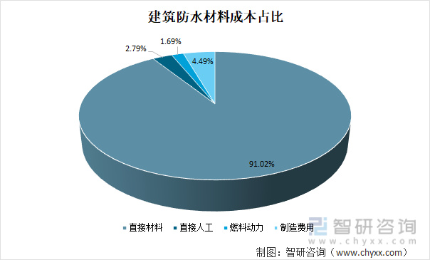 从建筑防水材料的成本占比情况来看,直接材料的成本占比最高为91.02%。而防水材料生产所需的原材料主要为沥青、聚酯胎基、SBS改性剂、基础油、膜类(含隔离膜)、聚醚、乳液、石蜡等石化产品,因此产业生产成本与国际成品油价格息息相关。