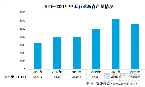 石油沥青是原油加工过程的一种产品,在常温下是黑色或黑褐色的粘稠的液体、半固体或固体,主要含有可溶于三氯乙烯的烃类及非烃类衍生物,其性质和组成随原油来源和生产方法的不同而变化。2021年中国石油沥青产量为5551.7万吨,同比下降11.59%。