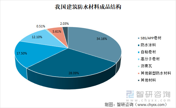 目前我国防水材料主要有传统的沥青油毡类防水卷材以及SBS/APP改性沥青防水卷材、高分子防水卷材、防水涂料、自粘防水卷材、玻纤沥青瓦和其他新型防水材料等。其中,防水卷材占比最大,占比达到63.76%。
