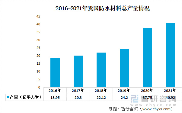 防水材料经过施工,在建筑物表面形成整体防水层,以达到防水的目的或增强抗渗透水的能力,所以防水材料对建筑工程的安全和寿命起着十分重要的作用。根据中国建筑防水协会显示:2021年全国建筑防水材料产量合计约为40.92亿平方米(因统计口径调整,2021年数据与图表数据存在差异;根据新的统计口径,2020年全国建筑防水材料产量为37.75亿平方米),同比增长8.41%。